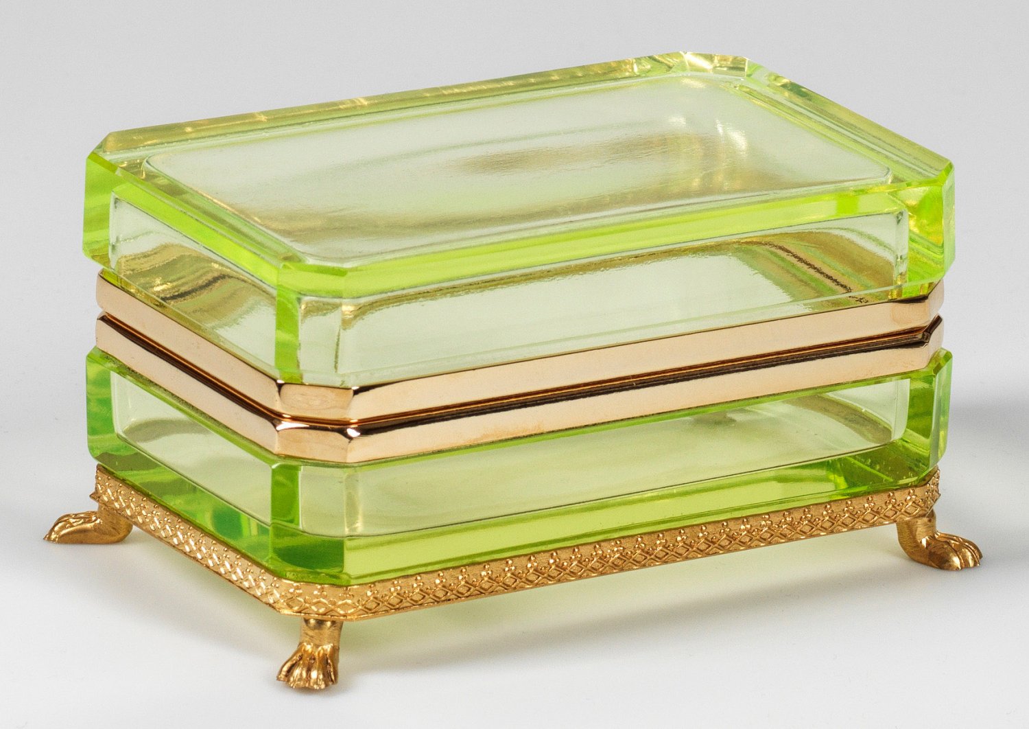 A French Art Deco cut and polished yellow Uranium glass (Vaseline glass) with brass-mounted hinged cover and paw feet.