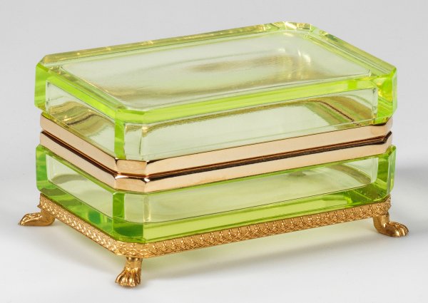 Rechteckige Form mit abgeschrägten Ecken. Geschliffenes und poliertes, gelbes, transparentes Uranglas. Scharnierte Messingmontierung mit vier Tatzenfüßen. H. 7,2 cm, 13,2 cm x 8,5 cm.