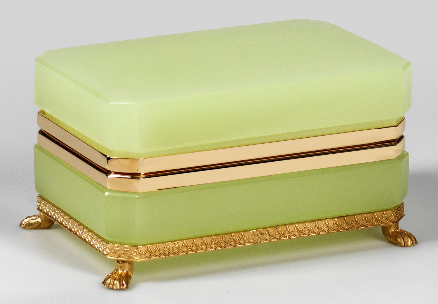 Rechteckige Form mit abgeschrägten Ecken. Geschliffenes und poliertes, limonengrünes bzw. limettengrünes, opakes Glas. Scharnierte Messingmontierung mit vier Tatzenfüßen. H. 7,2 cm, 13,2 cm x 8,5 cm.