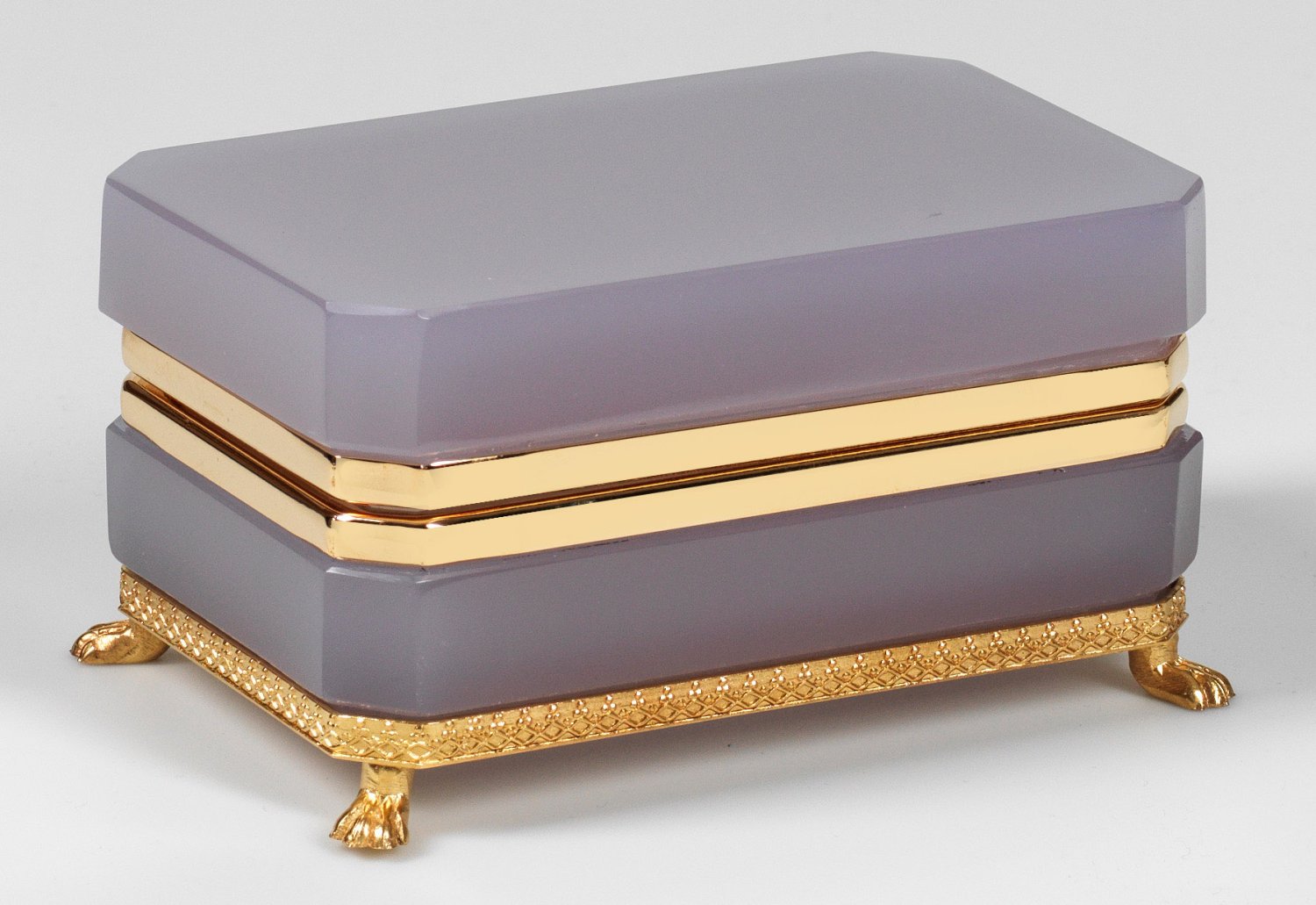Rechteckige Form mit abgeschrägten Ecken. Geschliffenes und poliertes, seladongrünes (unter UV-Licht rosafarbenes), opakes Alexandrit-Glas. Scharnierte Messingmontierung mit vier Tatzenfüßen. H. 7,2 cm, 13,2 cm x 8,5 cm.
