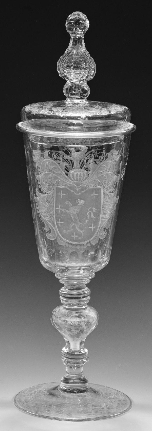 Farbloses Glas mit Schliff- und Mattschnittdekor. Flacher, leicht ansteigender Scheibenfuß mit umlaufendem Blatt- und Bütenrankenwerk, wabenfacettierter, teilw. hohler Balusterschaft mit Scheibennodi, die konische Kuppa mit blanken Kugeln und Oliven. Schauseitig Wappenkartusche mit steigendem, zweischwänzigem Löwen und sechs Kreuzen, rücks. eine Blumenvase. Der gewölbte Stülpdeckel mit geschnittenem Rankenmotiv und hohlem, wabenfacettiertem Knauf. H. 40,5 cm.