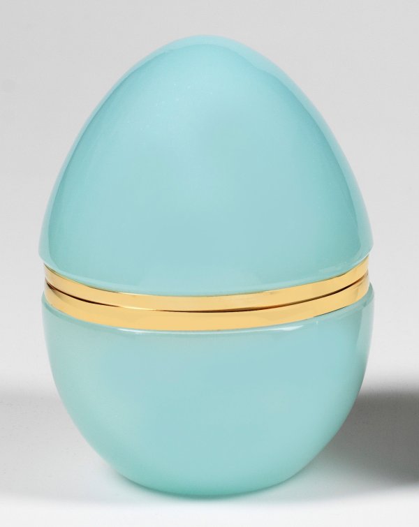 An egg-shaped French Art Deco light blue glass box with brass-mounted hinged cover.
