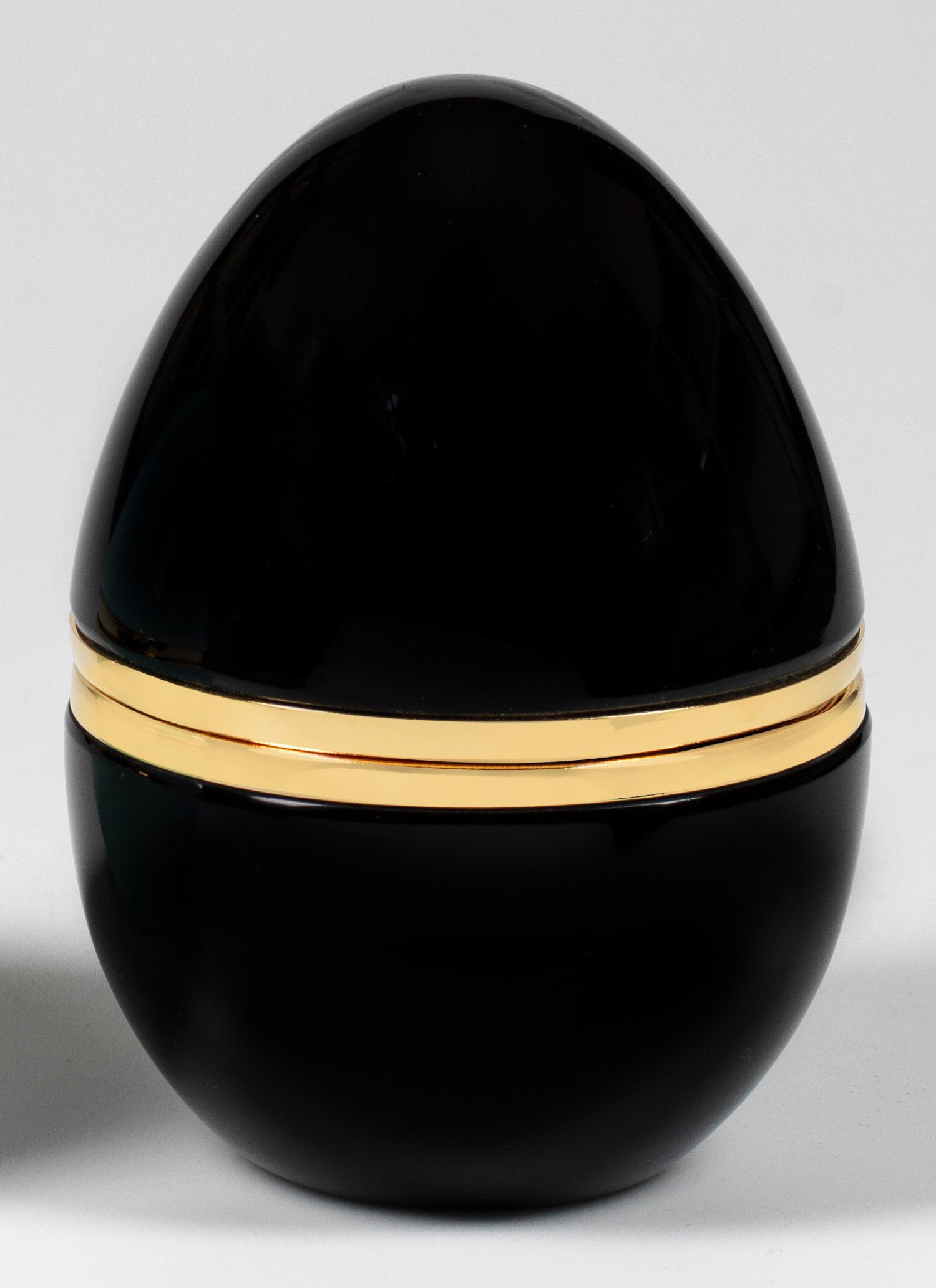 An egg-shaped French Art Deco black glass box with brass-mounted hinged cover.