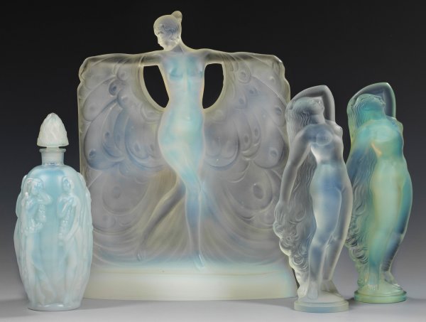 Bestehend aus zwei gleichen weiblichen Aktstatuetten "Reveil", einem Parfumflakon "La Ronde Fleurie" mit einem Fries weiblicher Akte und der Aktfigur "Suzanne au bain". Opaleszierendes Glas, in die Form geblasen, teilw. satiniert, geschliffen und poliert. Entw. Marius Ernest Sabino, um 1925-1930. Jeweils mit Firmenmarke mit Bez. Paris, eine Statuette mit Etikett "Sabino MADE IN FRANCE". H. 15 cm-22,8 cm.