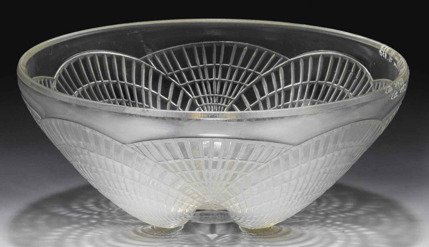 Flach gemuldete Form. Bläulich opaleszierendes Glas, in die Form geblasen. Stilisierter Muscheldekor im Relief. Modell-Nr. 3202. Entw. René Lalique, 1924. Geschnittene Sign. "R LALIQUE FRANCE". D. 18,5 cm.