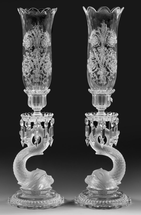 1-flg.; Farbloses Kristallglas, teilw. satiniert, geschliffen und poliert. Rosettenförmiger, reliefierter Fuß, auf sechseckiger Basis der Schaft als plastischer, im Barock-Stil gestalteter Delfin, oberhalb gegliederte Traufschale mit Kristall-Behang. Die einsteckbaren Windlichter in hoher Glockenform, vielpassigem Rand und geätztem Ankanthusdekor. Jeweils mit Firmenmarke. Ges.-H. 58,5 cm.