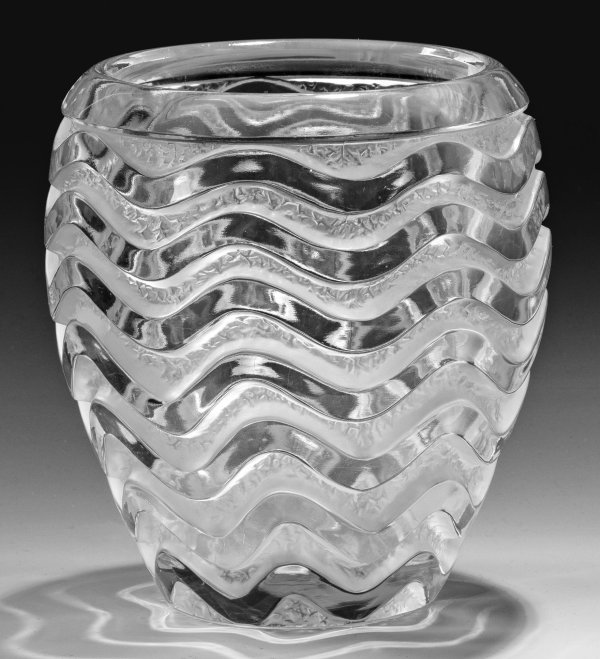Ovoide Form mit umlaufendem, flächendeckendem, reliefiertem Wellenbanddekor, Modell-Nr. 10-876, Entw. René Lalique, um 1934. Farbloses Glas, in die Form geblasen und satiniert, teilw. poliert. Sign.; H. 16,5 cm.