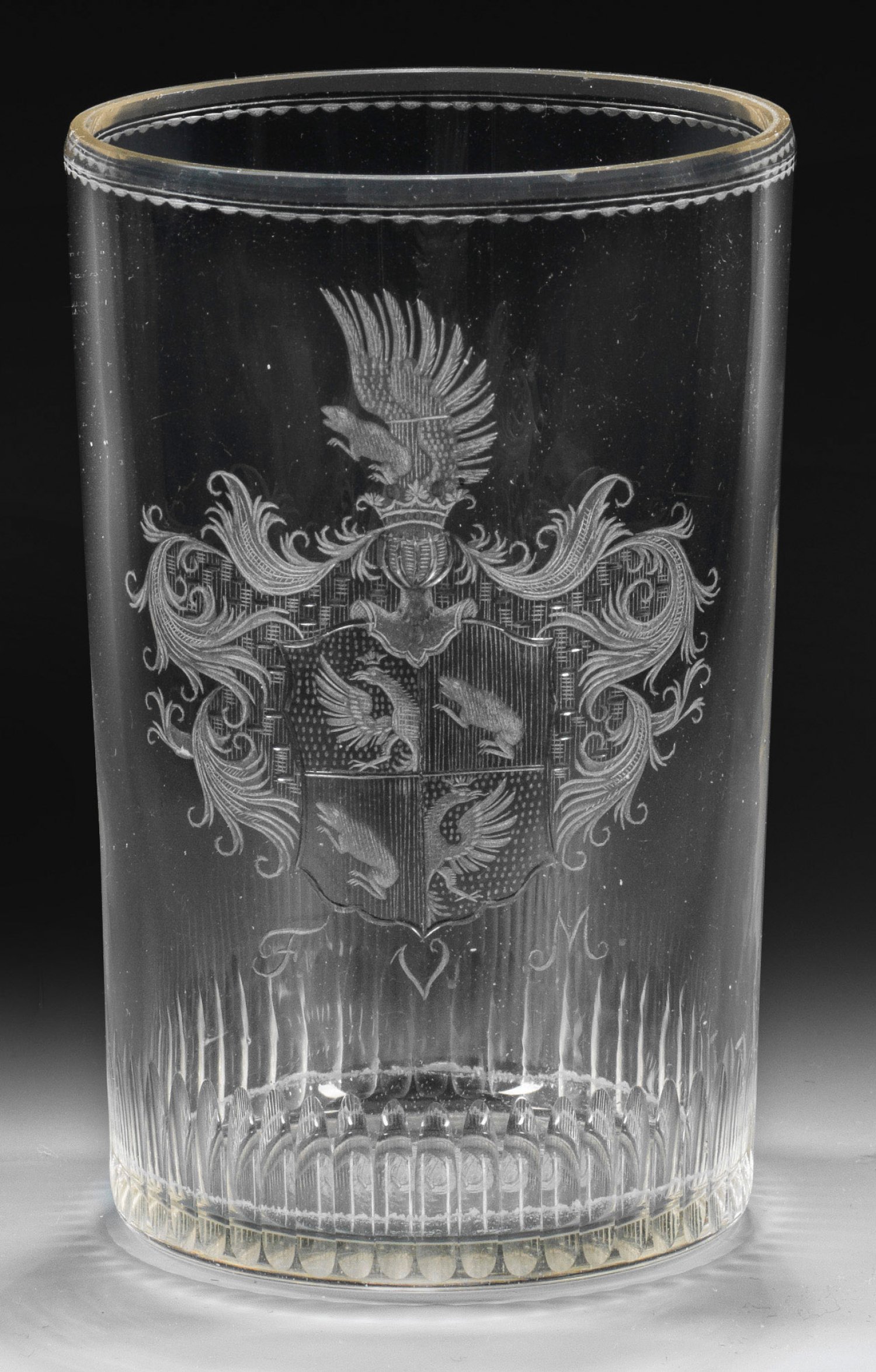 Zylindrisch. Schauseitig graviertes Adelswappen mit Helmzier und Federbusch sowie Monogramm "F, V. M." in sehr feinem, teilw. geblänktem Schnitt, am Stand eine Schliffbordüre. Lippenrand äußerst minim. best.; H. 12 cm.