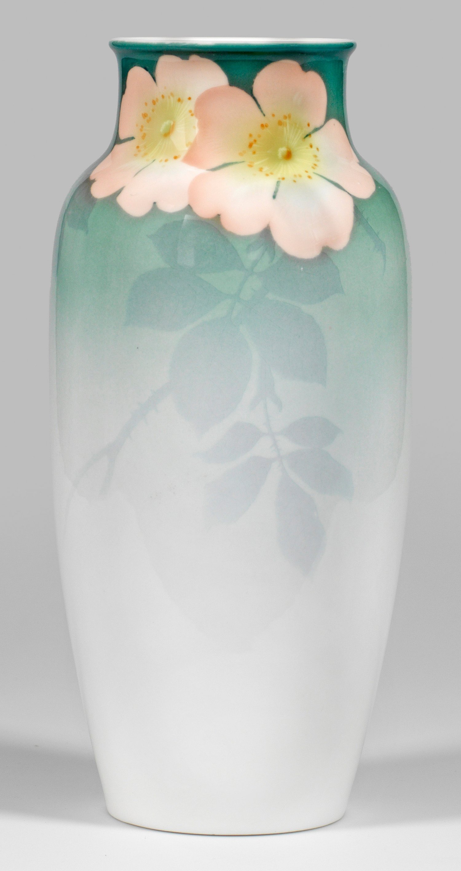 Über rundem Stand balusterförmiger Korpus mit eingezogenem Hals und gering ausschwingendem Rand. Auf der Wandung weiß-grün verlaufender Fond, oberhalb mit beidseitigem, sich überlappenden Anemonen in polychromer, pastelltoniger Unterglasurmalerei. Maler-Monogr. AK, wohl für Arthur Kloepel (ab 1891 in der KPM Berlin tätig). Im Boden bez. "35e" in Kapuzinerbraun, eingeritzt "P4", Nr. 4097" sowie Jahresbuchstabe. Kl. Glasurfehler. Zeptermarke. H. 25,5 cm.