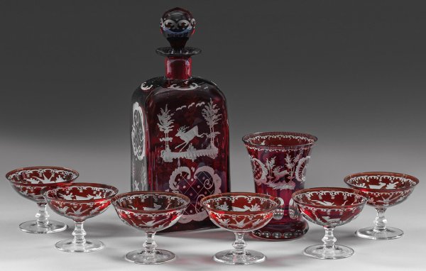 8-tlg.; Farbloses Glas, rubiniert, teilw. geschliffen. Bestehend aus rechteckiger Likörkaraffe mit Stöpsel, sechs Likörschalen mit facettiertem Schaft und einem Ranftbecher. Schnittdekore im Rokoko-Stil aus jagdbaren Tieren, Rocaillen und Ornamenten, beim Becher kombiniert mit Schliff. H. 6,2 cm-24,5 cm.