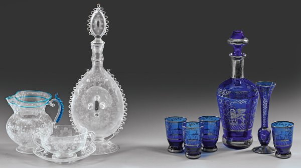 9-tlg.; 2 Karaffen mit Stöpsel, 4 Becher, Zierkrug und -vase, doppelhenkelige Schale mit Unterschale. Farbloses und blaues Glas. Teilw. gekniffen mit türkisblauen Fadenauflagen und Blütenrankendekor, bzw. Silver-Overlaydekor mit Venedig-Ansichten. Ein Stöpsel besch.; H. 5,8-32,5 cm; Unterschale D. 13,7 cm.