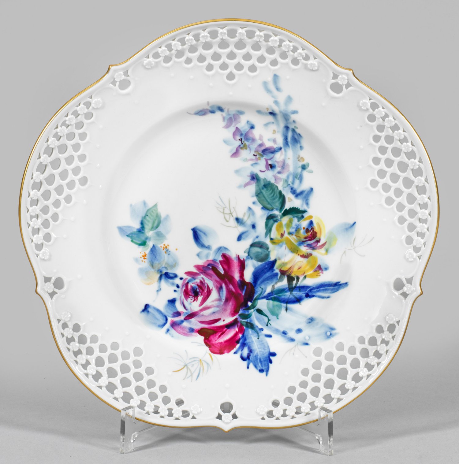 Form "Großer Ausschnitt". Blütenförmig geschweifte Form, im fünffachen Rapport durchbrochen gearbeiteter Rand, teilw. mit aufgelegten Blumen. Im leicht vertieften Spiegel komponiertes Blumenarrangement aus roter und gelber Rose. Unterglasurblaue mit polychromer Aufglasurmalerei. Goldrand. Form-Entw. Ludwig Zepner, um 1975. Dekor-Entw. Prof. Heinz Werner und Volkmar Bretschneider, um 1973 - 1975. Jahreszeichen. Schwertermarke. D. 28 cm.