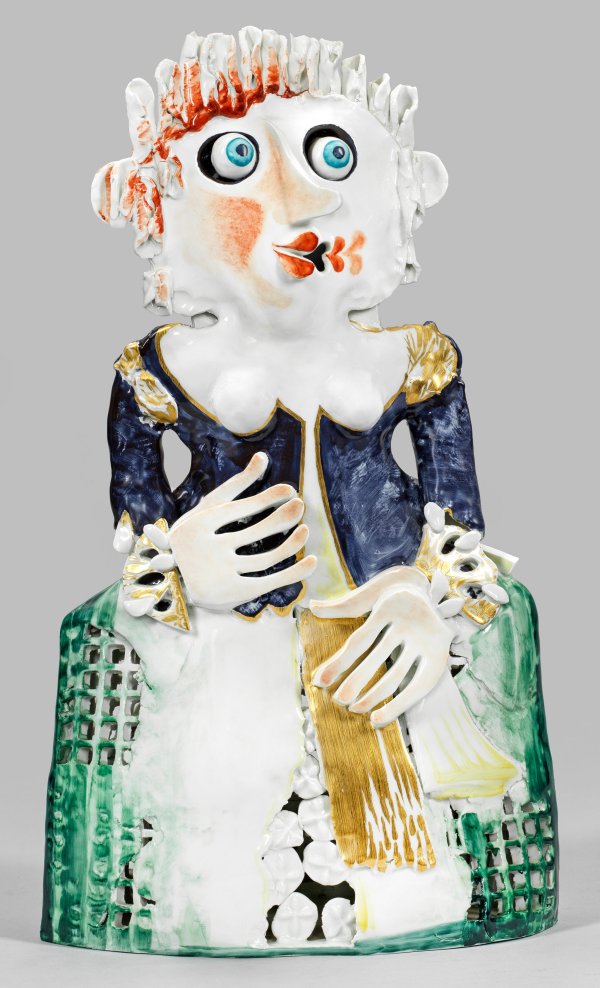 Über ellipsenförmigem Grundriss abstrakte Darstellung einer barockisierenden Dame in blauem Mieder über grünem, gitterartig durchbrochen gearbeitetem Krinolinenrock. Plastisch gearbeitet mit frei geformten und aufbossierten, glatt- und risskantigen, glasierten Formelementen. Polychrome Aufglasurmalerei mit breitem Pinselduktus und radierter Goldstaffage. Form- und Dekor-Entw. sowie Ausführung Peter Strang (1936 - 2022). Künstler-Sign. und Dat. "P. Strang Nov. (20)01". Reliefiertes, ligiertes Künstler-Monogr. PS (Werkstattzeichen). Geritzte Unikat-Nr. 357/2001. Schwertermarke. H. 60 cm. 33 cm x 15 cm.