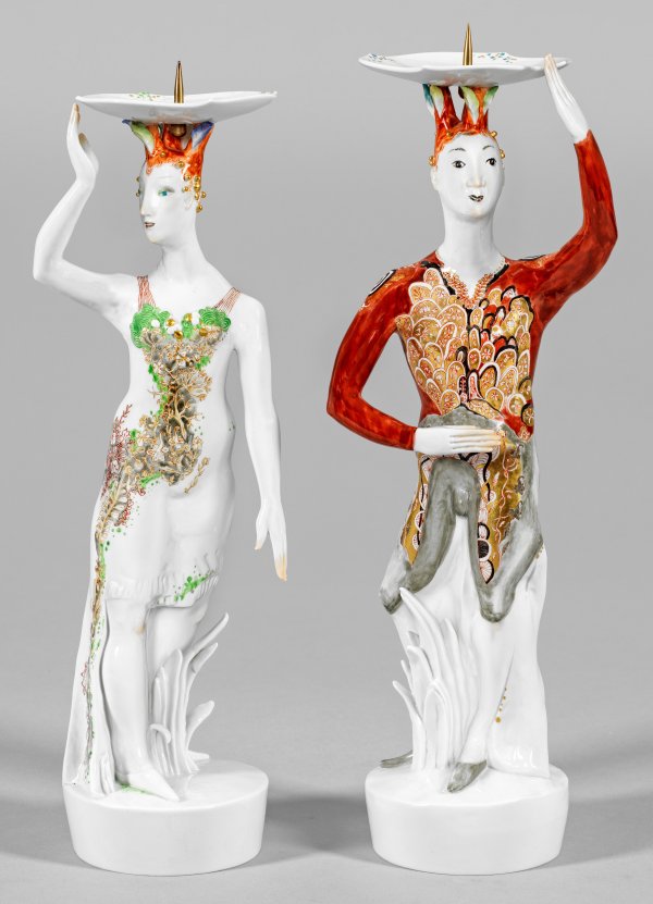 A pair of figural porcelain candlesticks, titled "Melusine" and "Florian" modelled by S. Klöde. Decor designed by G. Gaube. Crosses swords mark.