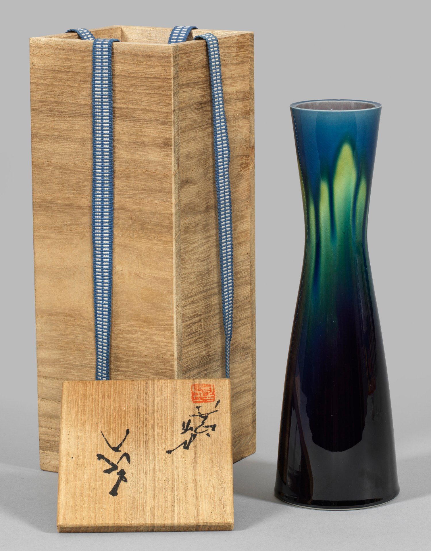 Porzellan. Langgestreckte, oberhalb leicht taillierte Kegelform, frei gedreht. Von hellblau über hellgrün bis dunkelviolett changierende, teilw. gelaufene Glasur. Im vertieften Boden eingepresst (oder geschnitten) eine stilisierte Blüte bzw. ein Blatt mit Pinsel-Sign.; Original-Tomobako-Holzbox mit Inschrift. Vasen-H. 25,5 cm.