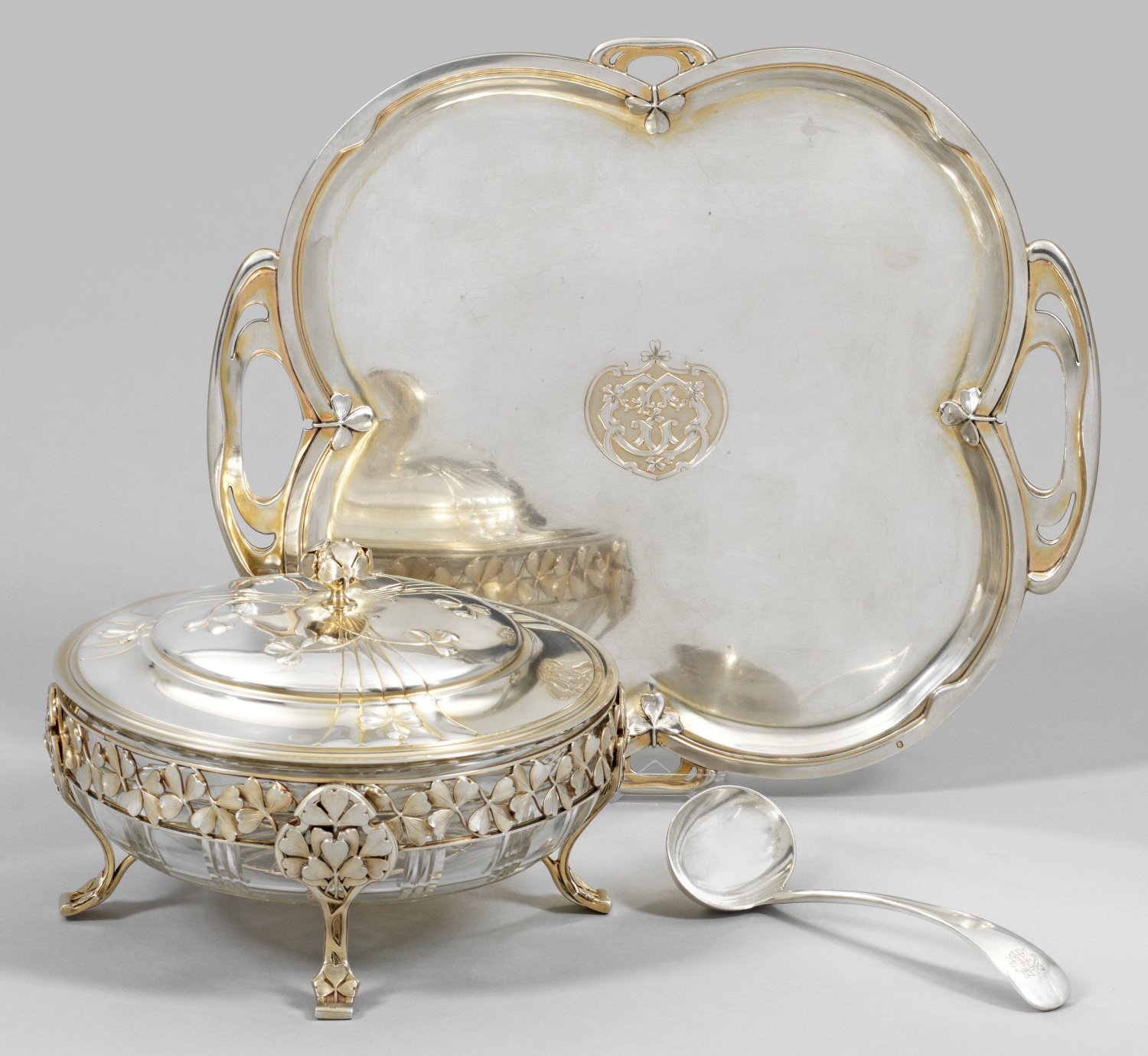 Silber, voll vergoldet. Vierpassig geschweiftes, gering gemuldetes Tablett, seitlich mit vegetabilen Handhaben und aufgelegten dreiblättrigen Kleeblättern verziert. Im glatten Spiegel zentral ein monogrammähnliches Ornament. Die Deckelterrine über vier schmalen, ausgestellten Füßen in filigrane, durchbrochen gearbeitete Wandung in Form eines Ornamentbands aus aneinandergereihten, naturalistisch gestalteten Kleeblättern übergehend. Mittig aufgewölbter Deckel mit zentralem Kugelknauf. Knauf und Deckel korrespondierend mit reliefplastischen, dreiblättrigen Kleeblättern verziert. Schale aus geschliffenem Kristallglas als Einsatz. Dazu eine versilberte Saucenkelle. Gest., Herstellerzeichen. Gew. ohne Glasschale ca. 1580 g. Terrinen-H. 14,5 cm. D. 20,5 cm. Tablett 34,3 cm x 29,6 cm.