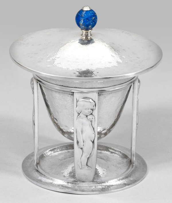 Silber. Über rundem, mittig gering aufgewölbtem Stand, durchbrochen gearbeitete vier vertikal aufsteigende Streben als Halterung für eine darin befestigte, glockenförmige Kuppa mit weit ausschwingendem Rand. Korrespondierend geformter, mittig sanft aufsteigender Deckel mit zentral montierter Lapislazuli-Kugel als Knauf. Die glatten Streben je mit reliefplastischer Darstellung eines stehenden Puttos mit einem Apfel in der Hand. Stand, Kuppa und Deckel flächendeckend fein mit unterschiedlich großem Hammerschlagdekor umzogen. Innen vergoldet. Wohl nach einem Entwurf des deutschen Bildhauers Adolph Amberg (1874-1913). Gest. 800, Herstellerzeichen, Händlermarke "POSEN. Gew. ca. 600 g. H. 15,5 cm.