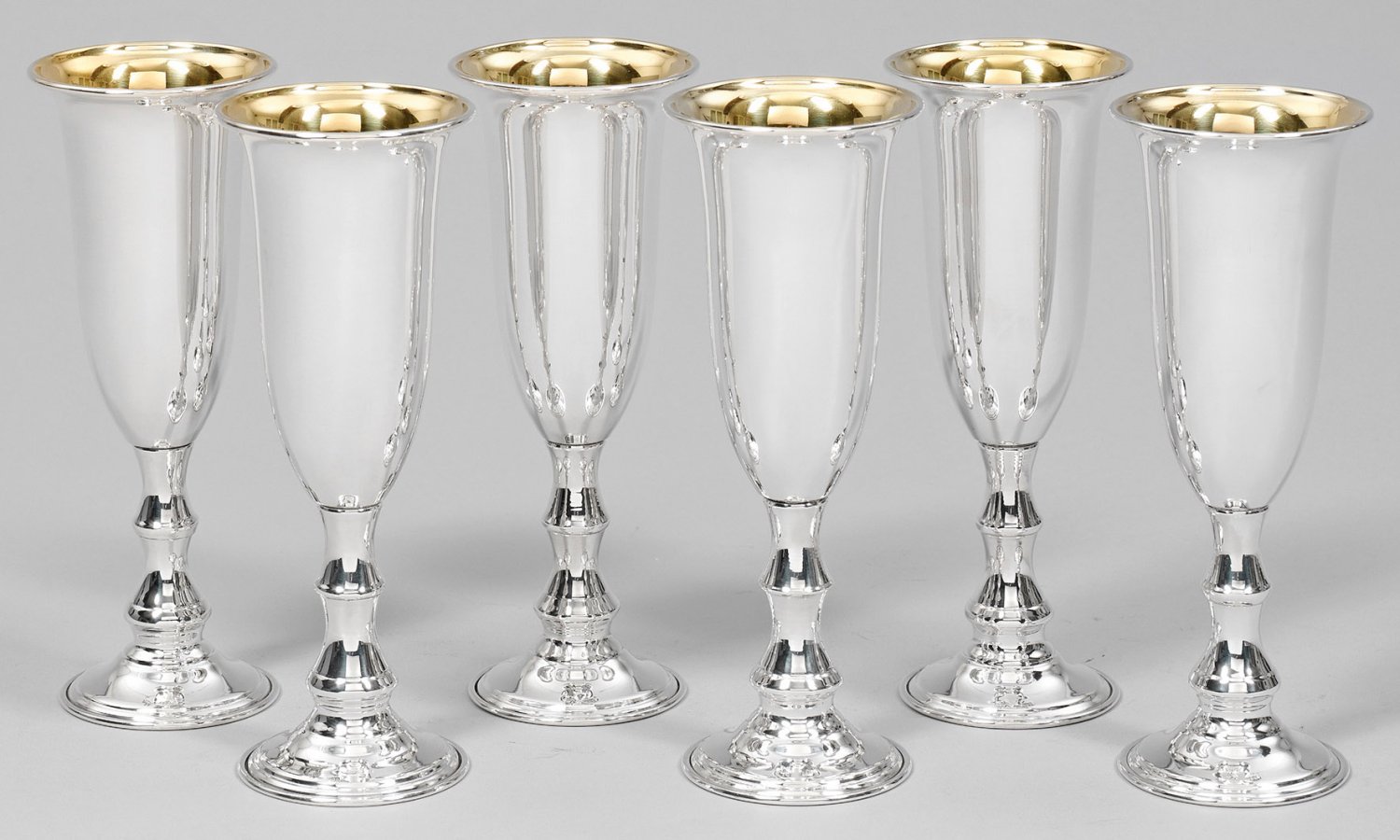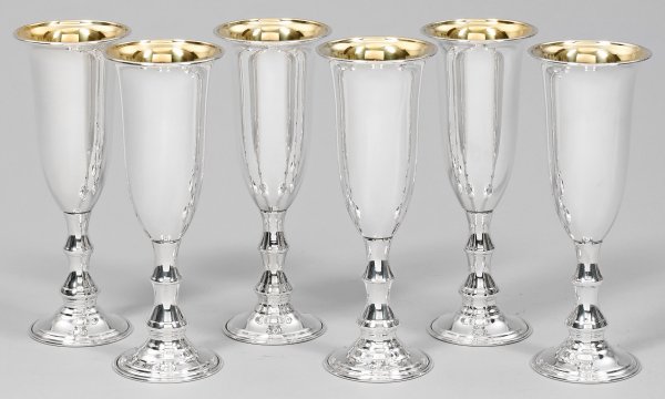 Six German Sterling silver champagne flutes. Gilt inside. Standard mark 925.