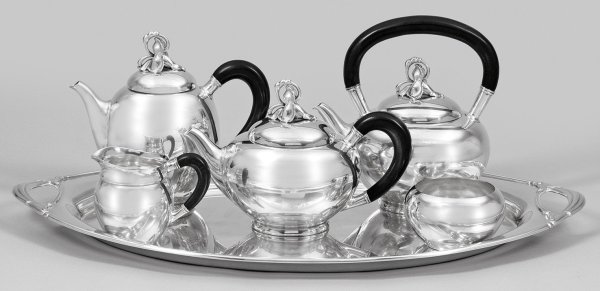 Sterlingsilber. 6-tlg.; Kaffee- und Teekanne, Heißwasserkessel, Zuckerschale, Sahnegießer und Tablett. Sich bauchig erweiternder, ovoider Korpus über flachem, gering gekehltem Rundstand. Glatter, ohrenförmiger Holzgriff bzw. übergreifender -henkel. Tief angesetzte, kurze, konische Tülle. Aufgewölbter Steckdeckel bekrönt von vollplastisch ausgearbeitetem, großem Blütenknauf. Ovales Tablett mit seitlichen Griffmulden. Der Rand umzogen von korrespondierenden vegetabilen Zügen, in Blütenkelchen endend. Gest. Sterling, Herstellerzeichen. Gew. zus. ca. 5415 g. H. 6,5 cm - 22,5 cm. Tablett: 63 cm x 40 cm.