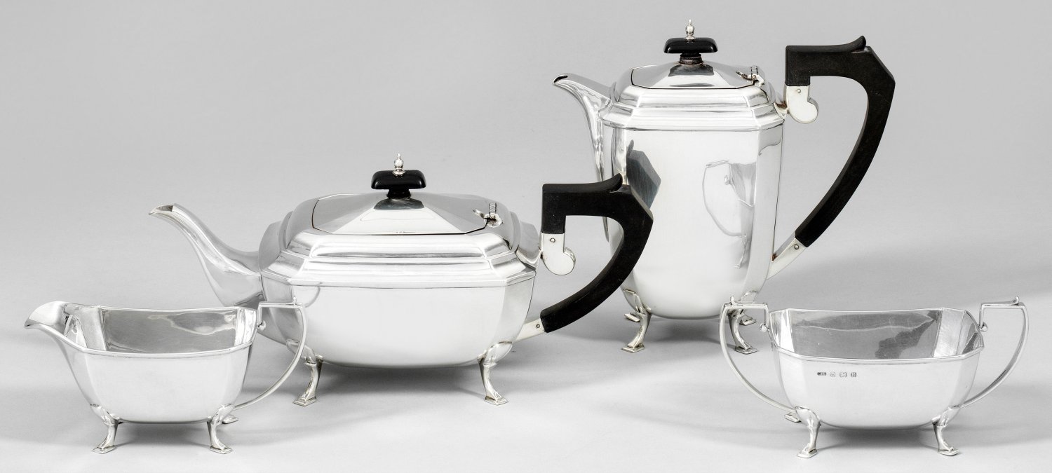 Sterlingsilber. 4-tlg.; Kaffee- und Teekanne, Sahnegießer und Zuckerschale. Über vier ausgestellten Füßen, rechteckiger, glatter und gebauchter Korpus mit abgeschrägten Ecken und Kanten. Abgesetzte, gering eingezogene Schulter, übergehend in leicht gewölbten Scharnierdeckel. Korrespondierender Holzknauf. Gekanteter, ebonisierter Henkel aus Holz. Gest., Beschaumarken, Herstellerzeichen, Jahresbuchstabe "O" sowie "N". Gew. zus. ca. 1820 g. H. 8,5 cm - 20,5 cm.