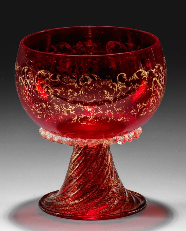 Rubinrotes Glas, teilw. farblose Fadenauflage und Goldfolieneinschmelzungen. Schrägoptisch geblasener Fuß und hohler Schaft, auf der gedrückt-kugeligen Kuppa radierter Golddekor mit weißen Emailpunkten. H. 15,5 cm.