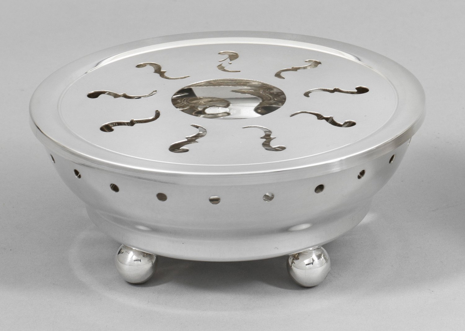 Sterlingsilber. Von vier Kugelfüßen getragener, glatter und aufschwingender Korpus mit abnehmbarer, ornamental durchbrochen gearbeiteter Deckplatte. Gest. 925. Gew. ca. 385 g. H. 6,5 cm. D. 15,5 cm.
