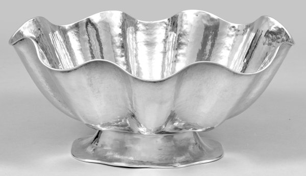 Silber. Über ovalem, passig geschweiftem Stand, hohe Schale mit sich wellenförmig erweiternder, ausgestellter Wandung und schmalem Lippenrand. Flächendeckend mit feinem Hammerschlagdekor verziert. Gest. 800, undeutl. Beschauzeichen mit Herstellernummer "306". Gew. ca. 975 g. H. 16,5 cm. 36 cm x 28,5 cm.