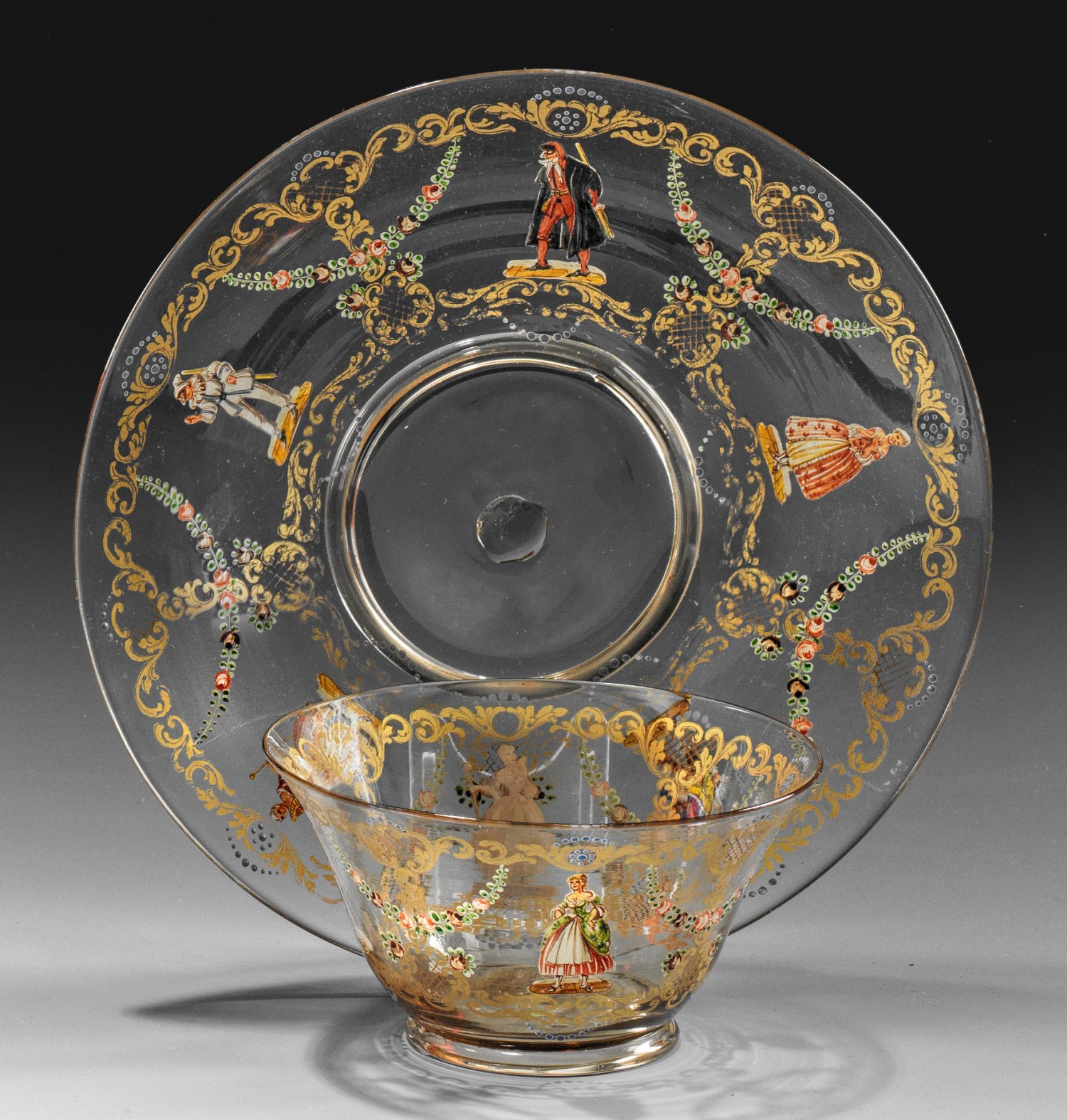 Rauchfarbenes Glas. Glockenförmige Schale, flache, leicht gemuldete Unterschale. Commedia dell'arte-Dekor in feiner, polychromer Email- und Goldmalerei. H. 3,2 cm-6 cm; D. 11 cm-18,5 cm.