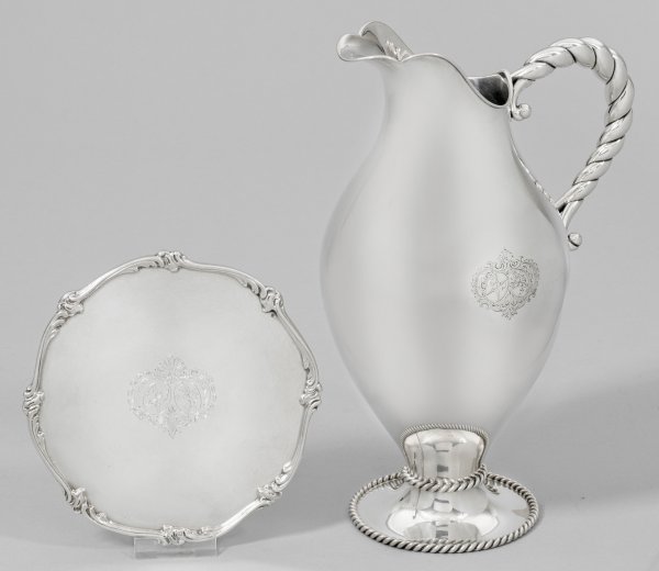 Sterlingsilber. Ausgestellter Rundstand, umzogen von reliefplastischem Kordelband, übergehend in bauchigen, hohen Korpus. Elegant glatte Wandung schauseitig mit graviertem, von Rocaillen gerahmtem Allianzwappen. Passig geschweifter, ausgestellter Ausguss. Seitlicher Henkel aus zwei gekordelten, an den Ansätzen zweigeteilten und in Kugeln endenden Strängen. Der runde Untersetzer über vier stark gedrückten Kugelfüßen, am Rand mit abweichendem Dekor, umzogen von erhabenen Voluten. Zentral mit korrespondierender Wappengravur. Gest. 925, Herstellerzeichen, Juweliersmarke von Johann Dix, Köln/Bonn. Gew. zus. ca. 1060 g. H. 26 cm. D. 15 cm.