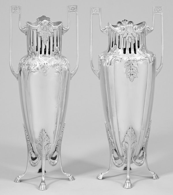 Sterlingsilber. Über vier stilisierten Füßen, schlanke Beine mit Akanthusblattansatz, verbunden mit Blattkranzfestons. Sich konisch erweiternder, hoher, glatter Korpus, verziert mit vertikalen, vegetabilen Zierlinien. Gerundete Schulter, abgesetzt durch reliefierte und volutierte Blattdarstellungen. Zylindrischer, stabförmig durchbrochen gearbeiteter Hals korrespondierend mit Akanthusblättern und Muschelwerk verziert. Hohe, schmale und gekantete Handhaben mit Blütenrosette. Gest. 925, Herstellerzeichen. Gew. zus. ca. 3210 g. H. 46,5 cm.