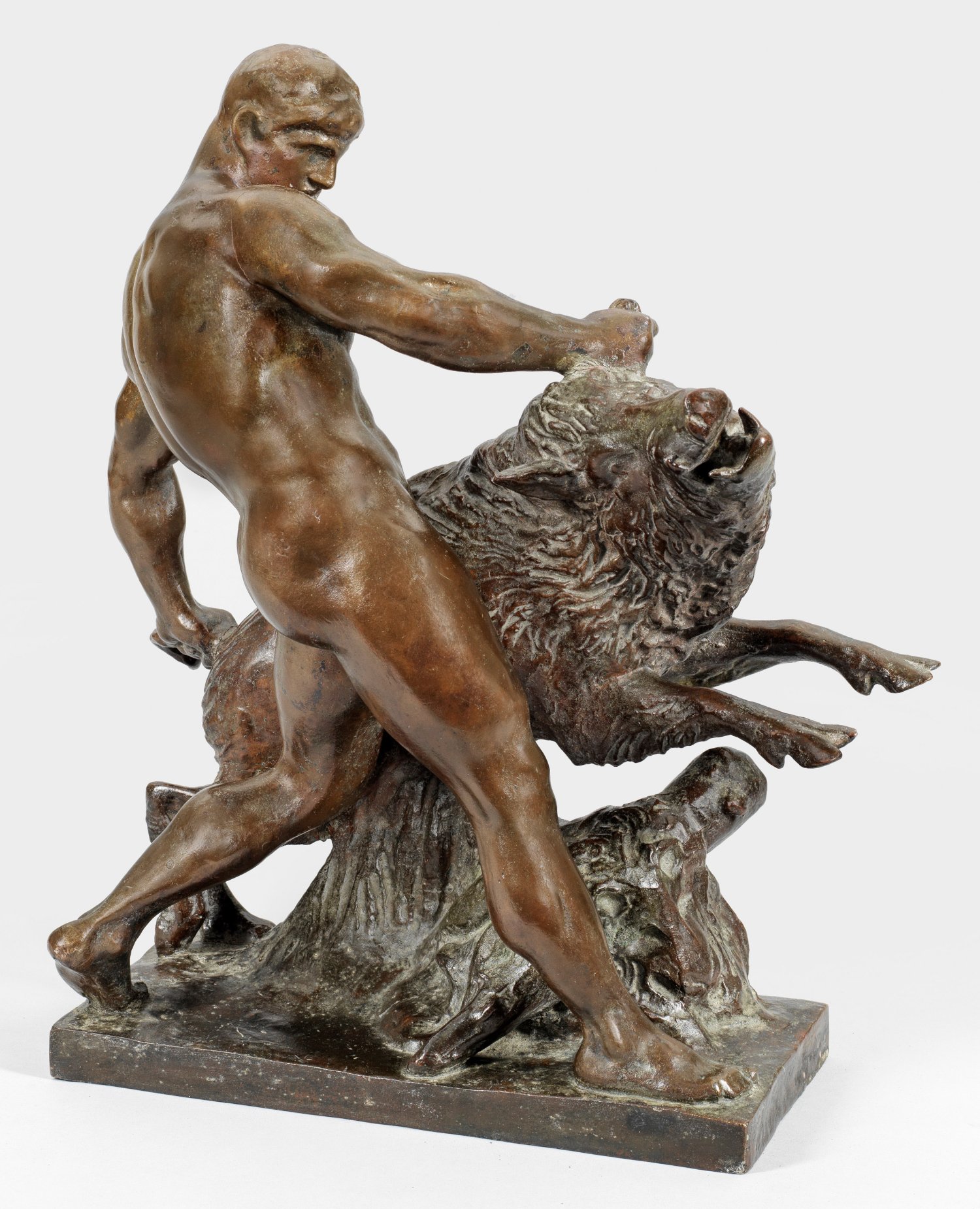 Bronze, dunkelbraun patiniert, 1899/1901. Sign.; Gießerstempel von Martin & Piltzing, Berlin. Frühguss von 1901 oder kurz danach. Im breiten Ausfallschritt stehend wird Herkules ganz als Kraftmensch dargestellt, der den Eber fest gepackt hat. Die von Rodin beeinflusste Gruppe gehört zu den bedeutendsten Werken des Bildhauers, der 1885-1903 in Rom lebte. 1899/1900 schuf er im Rahmen eines von ihm gewonnen Bildhauerwettbewerbs das Modell für eine lebensgroße (nie realisierte) Bronzeversion auf einer Treppenwange in der Nationalgalerie in Berlin. 1901 entstand in Rom ein erster Bronzeguss nach dem kleinen Gipsmodell (Leihgabe in der Kunsthalle Bremen); weitere, 1901 und in den Jahren danach ausgeführte Güsse befinden sich u.a. in der Nationalgalerie in Berlin und im Wallraff-Richartz-Museum in Köln. 1902 zeigte Tuaillon die Bronze erstmals in der 5. Kunstausstellung der Berliner Secession unter dem Titel "Herkules mit dem Eber". Erst um 1910 entstand eine große Marmor-Version; um 1937 ließ die Tochter des Bildhauers Eva Tuaillon hiernach einen Bronzeguss ausführen, welcher in den 1960er Jahren auf dem Lützowplatz in Berlin aufgestellt wurde. Ca. 49 cm x 40 cm x 20 cm.
