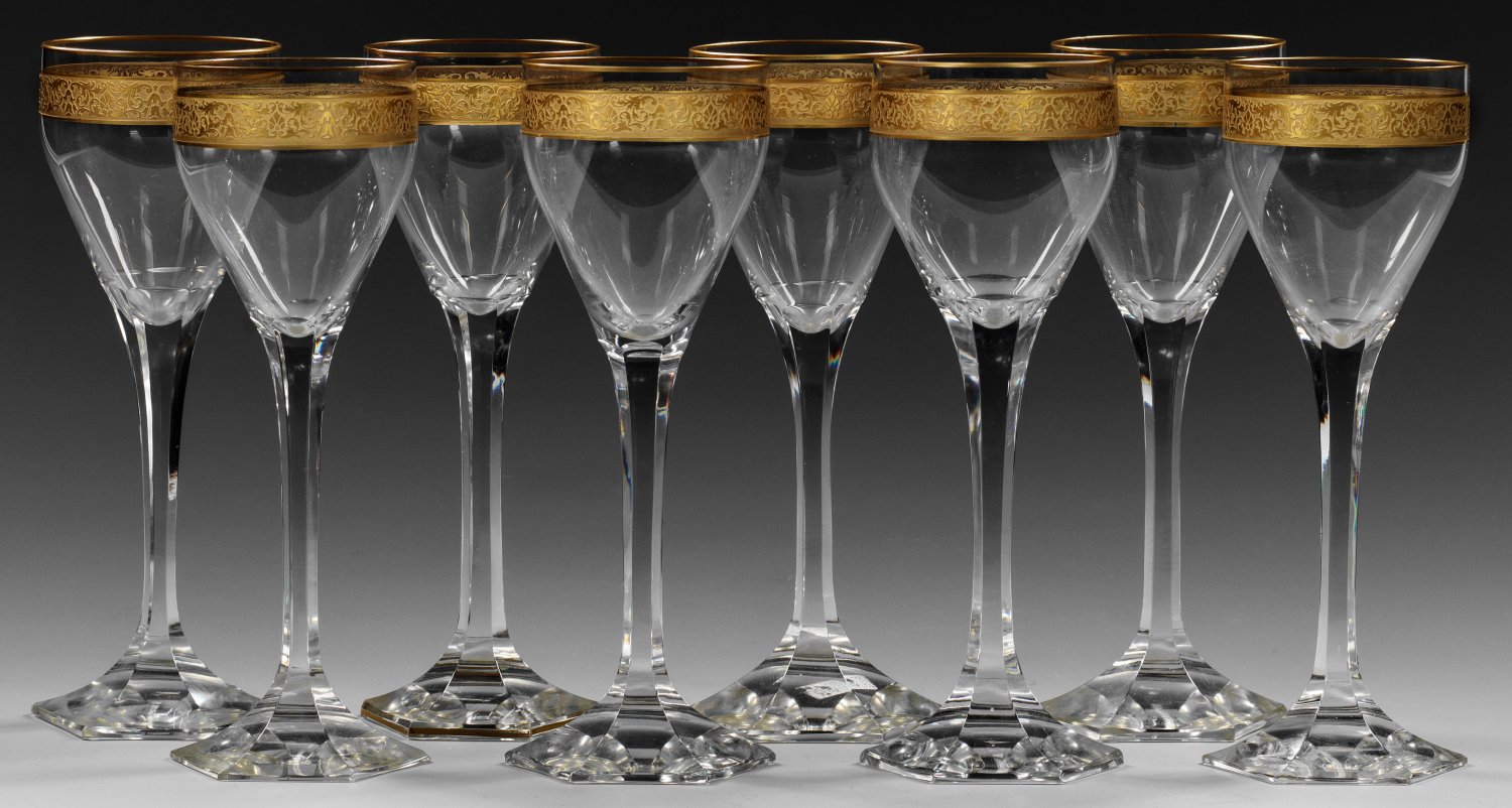 Eight Czechoslovakian cut wine glasses with acid-etched and gilt decor by Moser. A few very minor chips to the feet of some glasses.