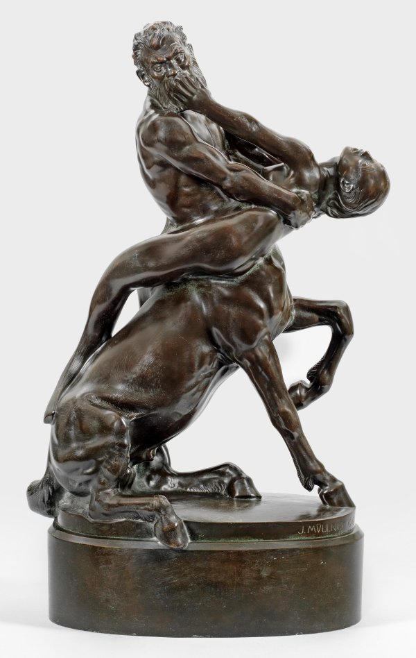 Bronze, dunkel patiniert. Sign. u. dat. 1919. Gießerstempel "ERZGIESSEREI A.G. WIEN". Monumentale, vollplastische Figurengruppe auf einem ovalen Sockel mit szenischer Darstellung aus der griechischen Mythologie (nach Homer, Diodor und besonders Ovid). Stilistisch verbindet die Bronze Einflüsse des Neoklassizismus mit denen des Jugendstils und der Wiener Secession, deren Mitglied Müllner 1906-1911 war. Bereits 1910 wurde Müllner Professor an der Wiener Akademie, 1922 Leiter der Meisterschule für Bildhauerei. In seinem frühen Oeuvre bis ca. 1920 schilderte er oft symbiotische Darstellungen von Mensch und Tier, stellte Motive aus der antiken Mythologie dar, mit Vorliebe auch Mischwesen wie hier. H. 92 cm.
