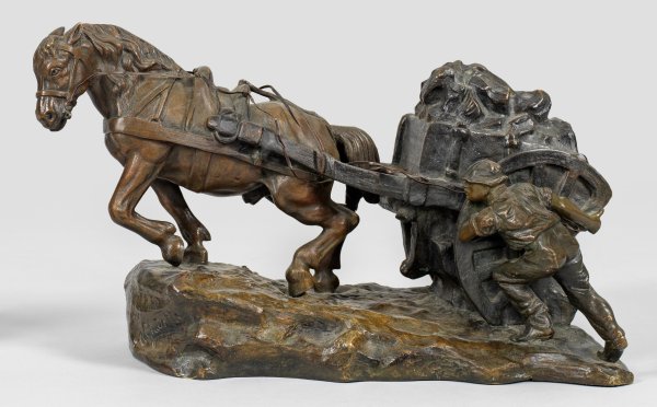 Bronze, in verschiedenen Tönen patiniert. Sign. "a. Giudotti". Vollplastische, wohl um 1905 entstandene, realistische Gruppe eines einachsigen Pferdekarrens, bei dem das angespannte Pferd und der Fuhrmann höchste Anstrengungen aufwenden müssen, um es eine kleine Steigung hinaufzubewegen. H. 24 cm; B. ca. 38 cm.