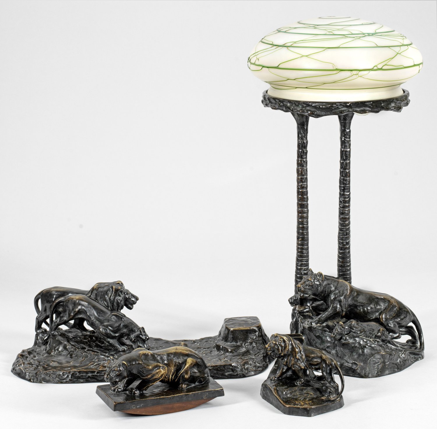 4-tlg.; Bronze, dunkelbraun patiniert. Jeweils sign., Ligatur-Monogramm "AR" der Gießerei Arthur Rubinstein, Wien. Bestehend aus: 1-flg. Tischlampe mit lauernder Löwin und Löwenjungen, Schirm aus böhmischem, opalisierendem, irisiertem Glas mit grünen Fadenauflagen (wohl Glasfabrik Elisabeth, Pallme-König & Habel, Kosten bei Teplitz); Schreibzeug mit Löwenpaar; Streichholzhalter mit einem Mähnenlöwen; Löschwiege mit kauernder Löwin. H. 10 cm-64 cm.