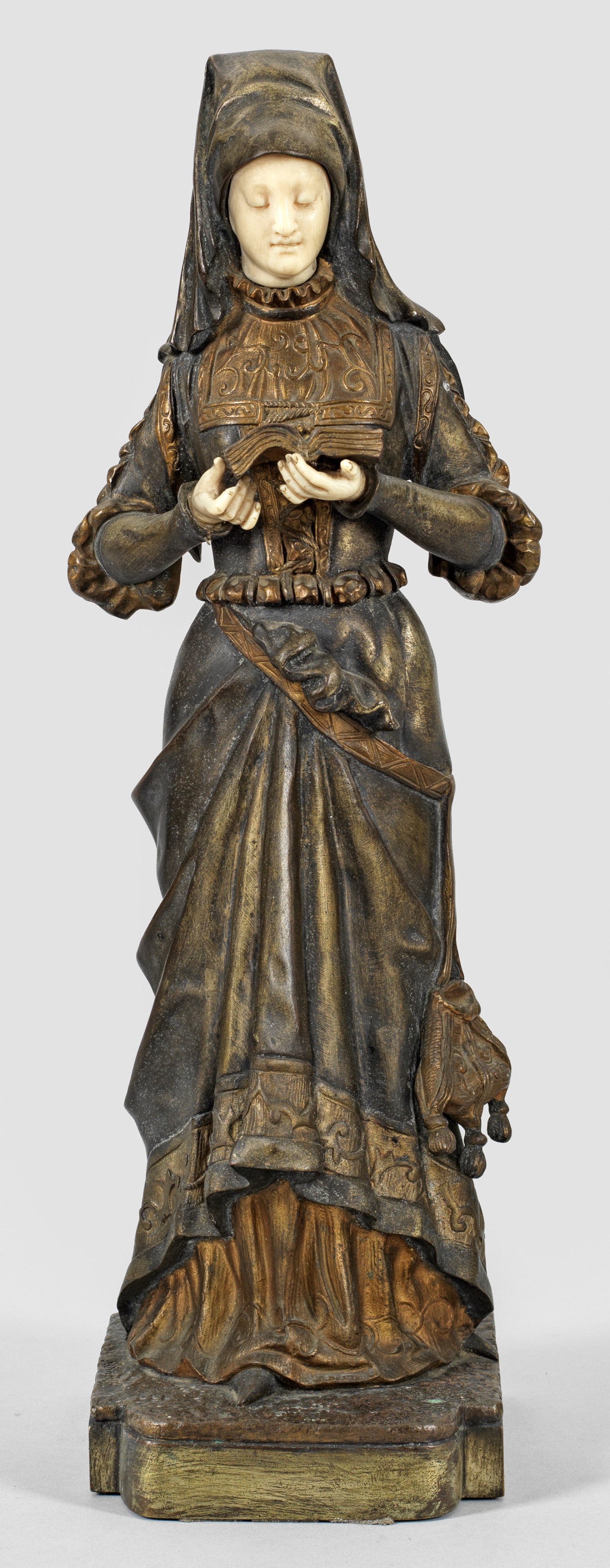 Bronze, in Brauntönen patiniert u. partiell vergoldet; Elfenbein, geschnitzt. Sign.; Vollplastische, große Statuette des Künstlers, der mit Vorliebe Chryselephantin-Figuren schuf und hiermit auf den Salons der Sociétée des artistes français vertreten war. Eine Fingerspitze best.; H. 44 cm.