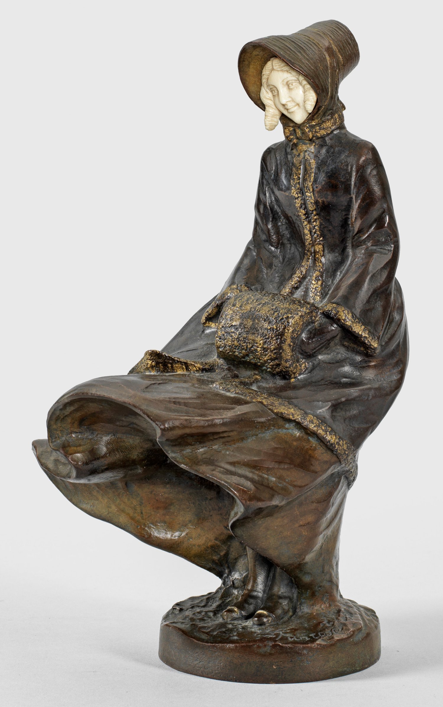 Bronze, patiniert; Elfenbein, geschnitzt. Sign. unter ihrem Pseudonym "Fanrose". Wohl um 1905-1910 entstandene, frühe Jugendstil-Chryselephantin-Figur der französischen Künstlerin, die 1896 als erste weibliche Bildhauerin an der École des Beaux-Arts in Paris aufgenommen wurde. Seit 1904 stellte Rozet auf den Salons der Société des artistes français in Paris aus, wo sie bis in die 1920er Jahre für ihre Werke im Stil des Art Nouveau und Art Déco mehrere Medaillen gewann. H. 24,2 cm.