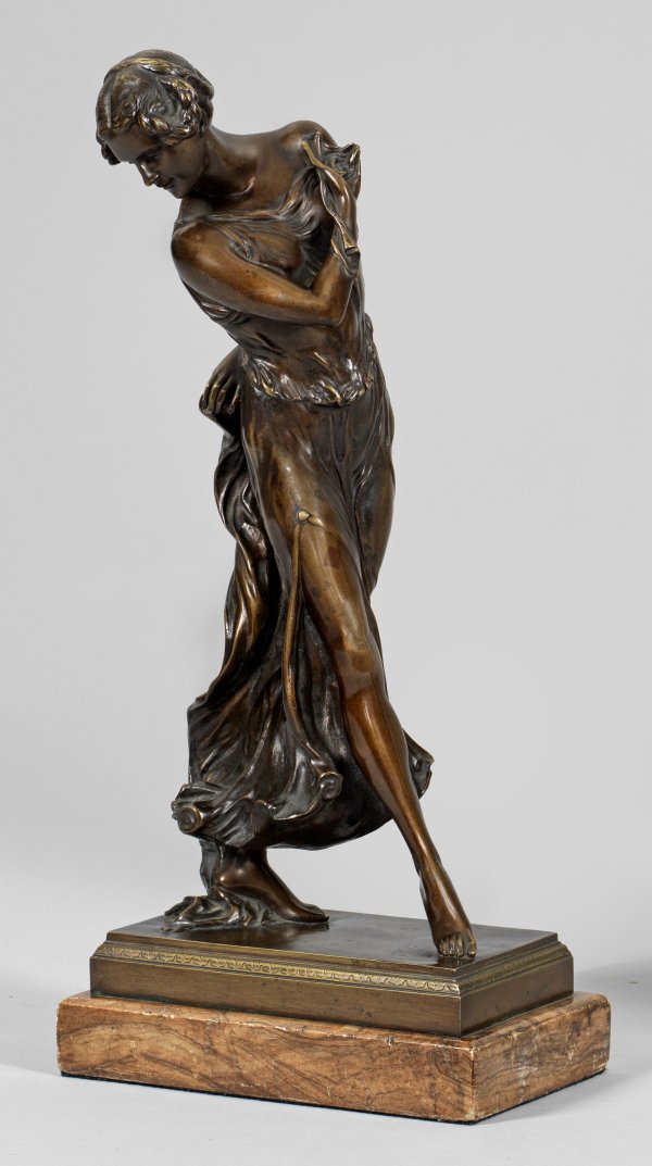 Bronze, braun patiniert. Gießer-Inschrift "AKT. Gesellschaft Gladenbeck D 1227", Marmorsockel. Vollplastische, in graziöser Pose stehende, zu ihrer rechten Seite nach unten schauende Tänzerin, deren dünnes Kleid hinten in beschwingten Wellen bis zum Boden reicht. Bronze-H. 38 cm; Ges.-H. 41,3 cm.