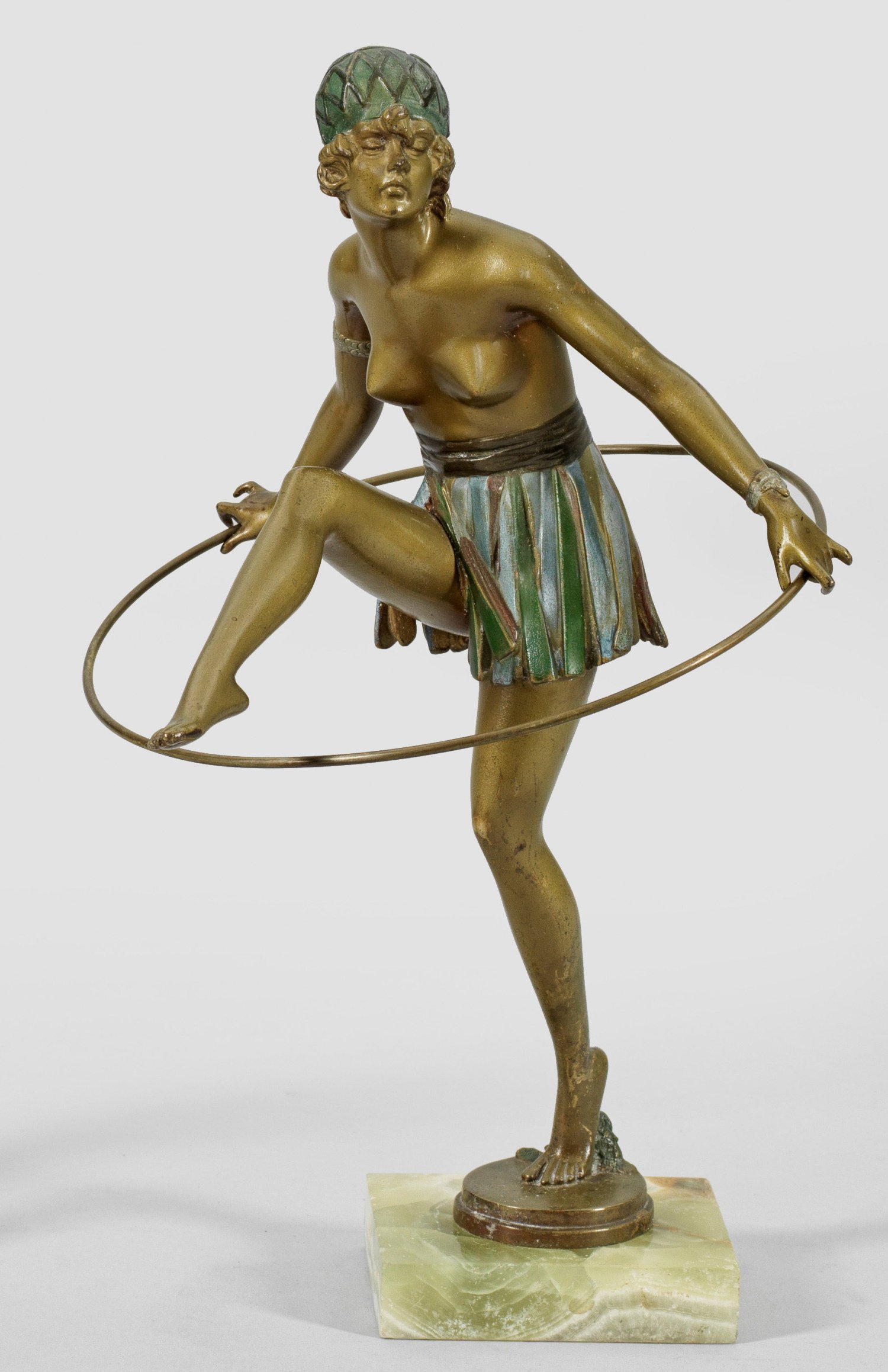 Bronze, farbige Kaltbemalung. Sign. unter seinem Pseudonym "F. Mazura". Hellgrüner Onyxmarmorsockel. In dynamisch-graziöser Pose stehende, nur mit einem Lendenschurz bekleidete Tänzerin, die mit erhobenem rechten Bein und ihren Händen den Reifen balanciert. Zach studierte Bildhauerei an der Wiener Akademie bei Hans Bitterlich und Josef Müllner. Seine Hauptschaffensperiode und sein künstlerischer Höhepunkt lagen in der Zwischenkriegszeit von 1918 bis ca. 1935. Außer Sport- und Tiermotiven stellte er mit Vorliebe Tänzerinen und junge Frauen dar, die oft freizügig erotisch bis frivol waren oder sogar aufreizend sadomasochistische Themen widerspiegelten. H. 27,5 cm.