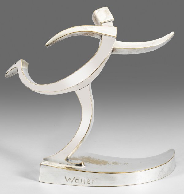 Bronze, versilbert, 1916. Guss wohl 1928. Sign.; Kubistische Bronzeplastik, welche die Figur, Dynamik und Bewegung des Schlittschuhläufers zu gebogten Formen abstrahiert, den Kopf zu einem Kubus. Die Arbeit gehört zu den frühen Kleinplastiken des bedeutenden avantgardistischen Künstlers, der seit 1912 der Künstlergruppe um Herwarth Waldens Galerie "Der Sturm" in Berlin gehörte. 1918 beteiligte er sich erstmals mit eigenen Skulpturen an der 61. Ausstellung der Galerie. Gegossen wurde "Der Schlittschuhläufer" zuerst in einer Auflage von 7 oder 8 Exemplaren (plus einigen HC-Exemplaren), erstmals gezeigt im Juli/August 1918 in der 65. Ausstellung der Galerie "Der Sturm" (unter Nr. 72). 1928 erhielt Wauer für "Der Schlittschuhläufer" eine Bronzemedaille beim Kunstwettbewerb der Olympischen Spiele in Amsterdam; wohl in diesem Zusammenhang wurde eine Auflage unter dem Titel "Figure in Motion" in versilberter Bronze ausgeführt. H. 24 cm; Plinthe ca. 17 cm x 10 cm.