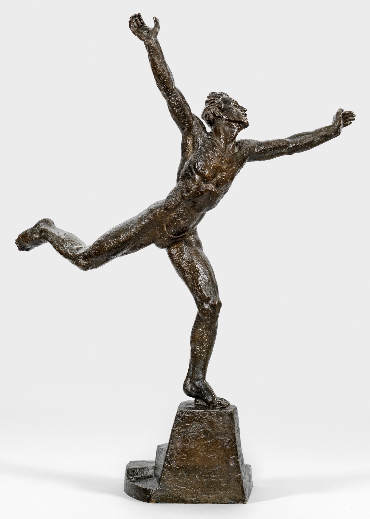 Bronze, dunkel patiniert. Sign. u. dat. 1924 mit Ortsangabe Tabor. Stempel "FDANTA ANYZ" der Gießerei Franta Anýz, Prag. Historisch bedeutende, vollplastische Darstellung eines Athleten als Halbakt, der mit zum Sieg erhobenen Armen die oberste Stufe eines hohen, kubisch gestalteten Podestes besteigt. Dusek wurde vom "Sokol"-Sporttreffen 1924 in Tábor inspiriert, wo er 1922 ein Atelier errichtet hatte. 1926 wurde ein Exemplar der Bronze bei der XV. Biennale in Venedig ausgestellt. Dusek studierte an den Akademien in Prag und Wien, Anfang der 1920er Jahre bei Antoine Bourdelle in Paris, bevor er 1924 nach Prag zurückkehrte. Im selben Jahr gewann er eine Bronzemedaille beim Kunstwettbewerb der Olympischen Spiele in Paris für seinen "Bogenschützen", 1925 auf dem Salon in Paris eine Silbermedaille für seine Skulptur "Der Läufer". H. 104 cm.