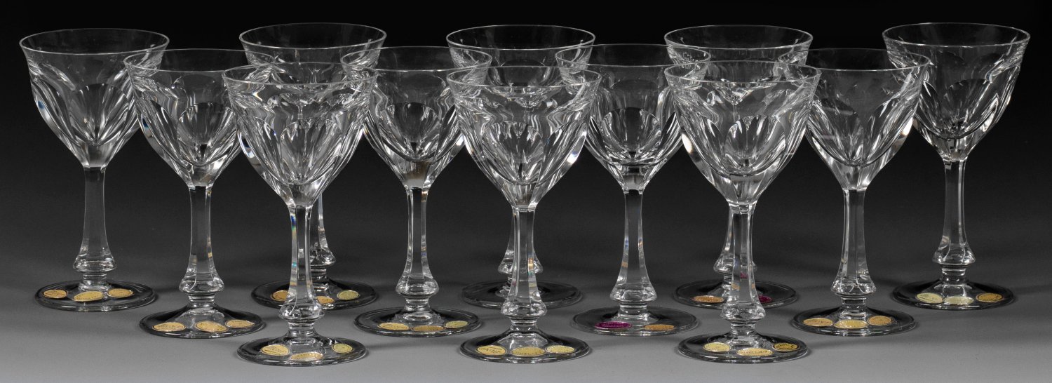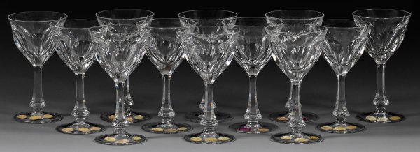 Farbloses Kristallglas, geschliffen. Flacher Scheibenfuß, Schaft und glockenförmige Kuppa mit sechsfachem Facetten-Schälschliff. Entw. 1916. Auf elf Gläsern Firmen-Ätzstempel "M" oder "MOSER" im Oval, auf neun Gläsern gelb-goldene Firmenetiketten, auf zwei Gläsern violett-silberfarbene Jubiläums-Etiketten 1957-1962 mit Bez. "MADE IN CZECHOSLOVAKIA". H. 12,3 cm.