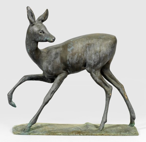 Bronze, dunkel patiniert, um 1940. Monogr.; Moderne Tierskulptur mit geglätteter Oberfläche, die in ihrer umrisshaften Stilisierung sowohl das Wesentliche in der Form und Statur des Rehs als auch dessen Wesen zum Ausdruck bringt. Der Bildhauer studierte 1919-1920 an der Stuttgarter Akademie; 1937 wurde Graevenitz an die Akademie berufen und 1938 deren Direktor. Bereits 1921 schuf Graevenitz eine erste Version seiner bekannten Bronze "Äsendes Reh", der weitere in verschiedenen Größen folgten (u. a. Killesbergpark sowie vor dem Graevenitz-Museum am Schloss Solitude in Stuttgart). Mit der vorliegenden Bronze vergleichbar ist die Plastik eines Rehs, die in den 1940er Jahren über dem Brunnen im Brunnensaal des Kurbades von Bad Sulzbach ausgestellt war. H. 42 cm