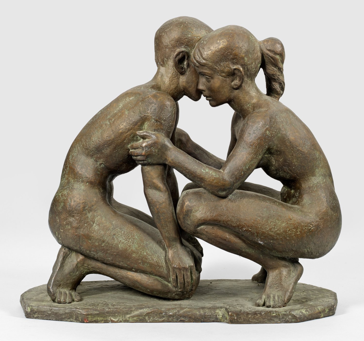 Bronze, dunkelbraun patiniert. Ligatur-Monogramm "EY", Stempel der Kunstgießerei Strassacker, Süßen. Aktfigurengruppe. Auf einer unregelmäßigen, ovalen Plinthe kniender Knabe und ein hockendes Mädchen mit Pferdeschwanz, in enger Vertrautheit die Köpfe aneinanderschmiegend. Wohl in den 1950er Jahren modelliertes Werk des Bildhauers, der aus einer Stuttgarter Künstlerfamilie stammte - sein Vater war der Kirchenmaler Rudolf Yelin der Ältere (1864 - 1940), sein jüngerer Bruder der Glasmaler Rudolf Yelin der Jüngere (1902 - 1991). Ernst Yelin selbst besuchte die Stuttgarter Kunstgewerbeschule und von 1922 bis 1927 die Stuttgarter Kunstakademie bei Ludwig Habich. Schon 1926 schuf er Skulpturen für die Wiederherstellung der gotischen Nikolauskapelle in Calw; nach seinem Abschluss an der Akademie führte Yelin infolge der beiden Weltkriege, wie viele andere Bildhauer der Zeit, insbesondere Gefallenendenkmäler und -reliefs aus, überdies zahlreiche Brunnen und Skulpturen für den öffentlichen Raum. Außer solchen größeren Arbeiten befasste sich Yelin mit weiblichen Figuren, Aktdarstellungen und erotischen Kleinplastiken. H. 54 cm.