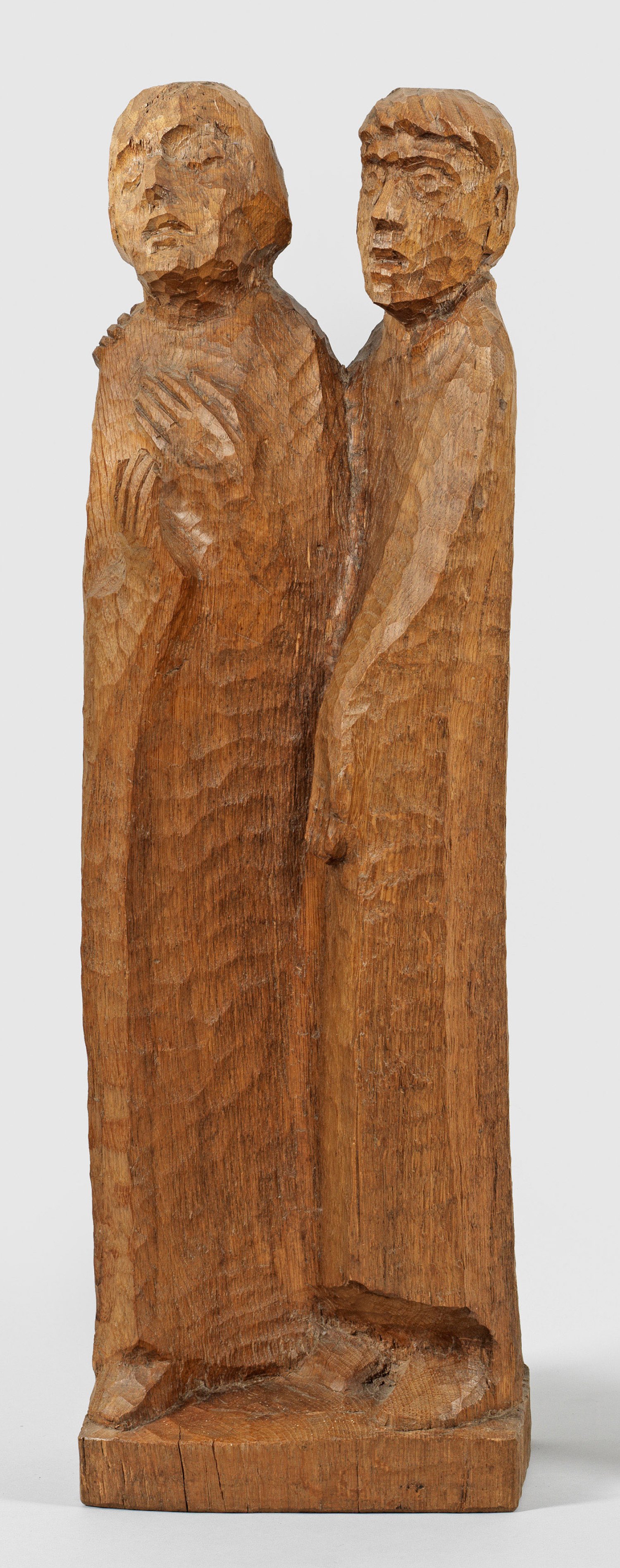 Eichenholz, geschnitzt mit sichtbar belassenen Bearbeitungsspuren, rücks. abgeflacht. Sign.; Annähernd vollplastische, blockhaft stilisierte, expressionistische, von Ernst Barlach inspirierte Skulpturengruppe mit der Darstellung zweier junger Männer oder auch Brüder in langen Gewändern, bei denen die rechte Figur der anderen in liebevoller Vertrautheit bzw. tröstend eine Hand auf dessen Schulter legt. H. 79 cm.