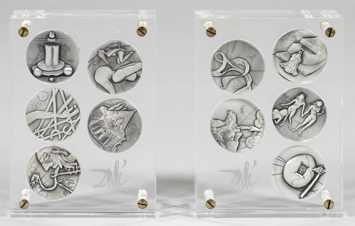 10 Reliefmedaillen aus 999er Feinsilber, 1975. Je sign. u. dat. sowie mit Silberstempeln. Hrsg. Diners Club, VGM Gesellschaft für Münzeditionen München in einer Gesamtauflage von je 7.500 Expl.; Eingebettet in zwei verschraubbaren Acrylglasblöcken. D. 4,8 cm. Blockhöhe 13 cm.