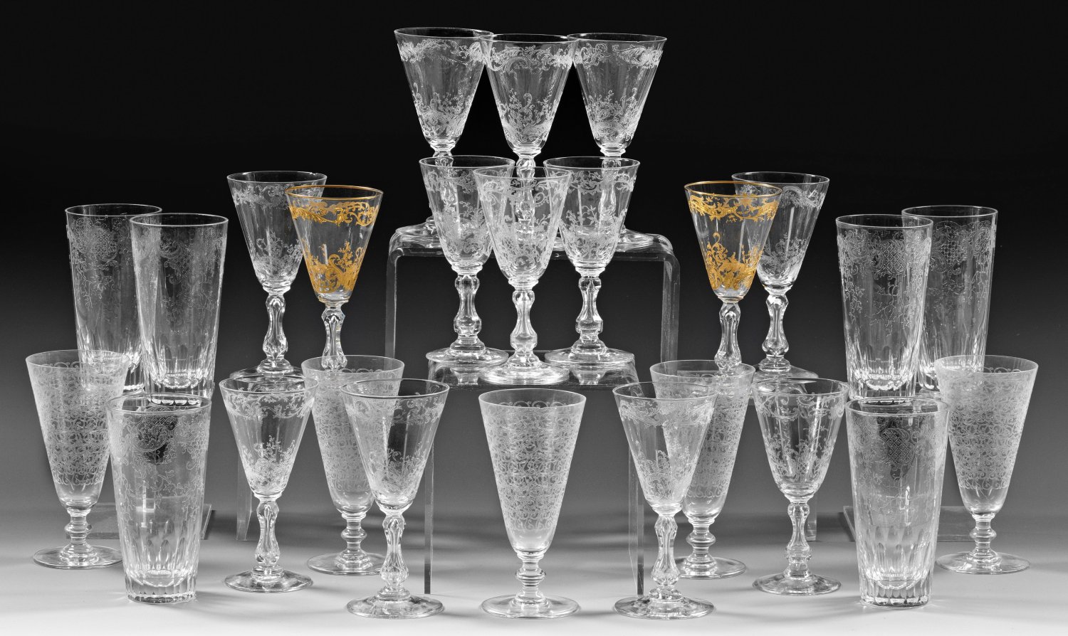 25-tlg.; Farbloses Kristallglas, partiell geschliffen. Geätzte Dekore. Fünf Baccarat-Sektflöten "Rohan", Entw. 1931, mit Baccarat-Ätzstempelmarke; außerdem 20 Saint-Louis Trinkgläser aus der "Micado"-Serie, darunter sieben größere Weingläser, fünf kleinere Weingläser, sechs Wasser- oder Limonadengläser sowie ein Paar Weingläser mit vergoldetem "Micado"-Dekor. H. 13,5 cm-15 cm.