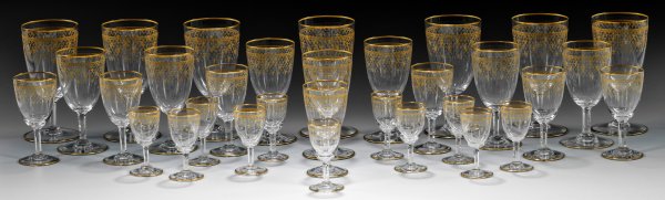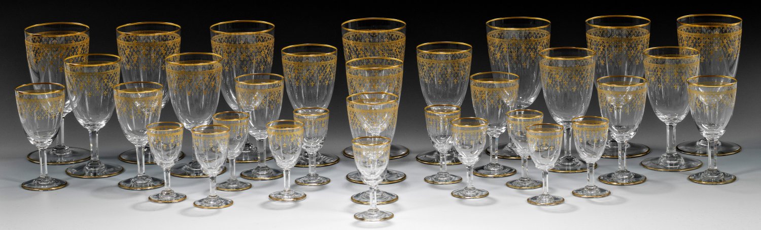 32-tlg.; Farbloses Kristallglas. Leicht ansteigender Scheibenfuß, sechsfach geschälter, facettierter Schaft, ovoide Kuppa. Umlaufendes, breites, geätztes und vergoldetes Friesband mit "Fleur-de-lis" Muster aus stilisierten burgundischen oder auch bourbonischen Lilien als Symbol der französischen Könige und Nation. Bestehend aus 7 Rotweingläsern, 7 Weißweingläsern, 7 Sherrygläsern und 11 Likörgläsern. Jeweils mit Firmen-Ätzstempel. H. 8 cm-15 cm.