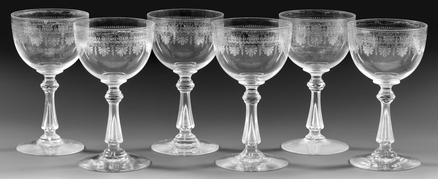 A set of six French probably Baccarat crystal wine glasses with acid-etched decor. Partially cloudy.