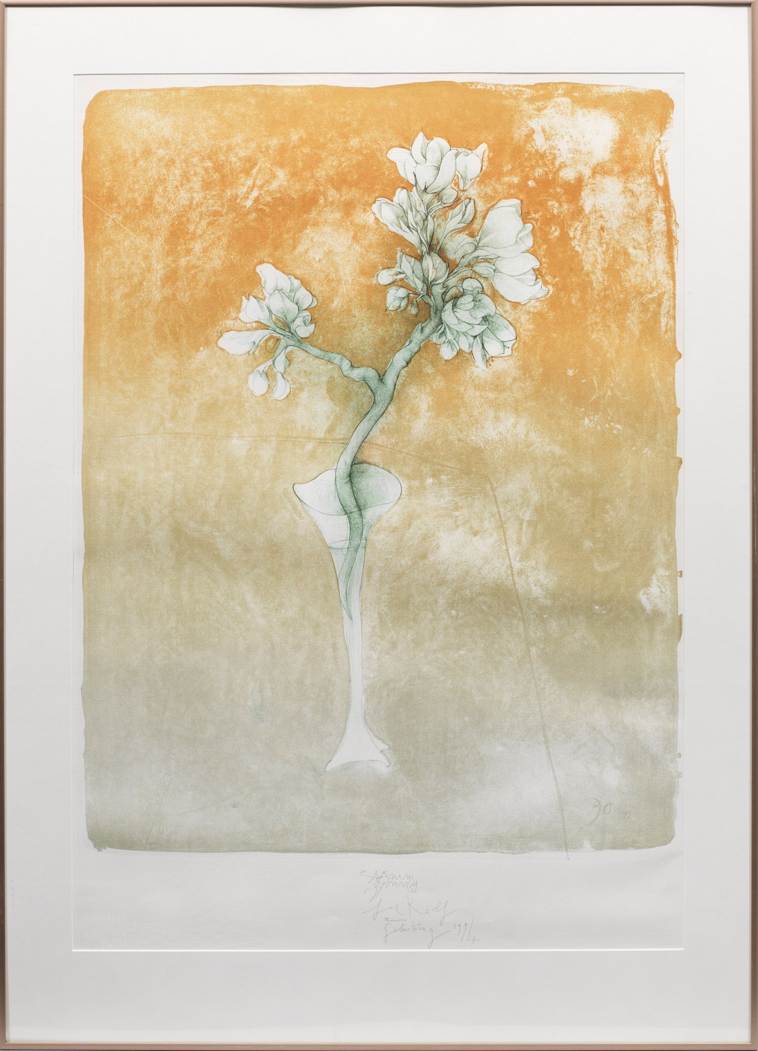 Farblithografie/Velin, 1990. Unten mittig sign. sowie mit 1994 datierter Widmung. Im Stein dat. (19)90. Darstellung ca. 75 cm x 59 cm. Rahmen.